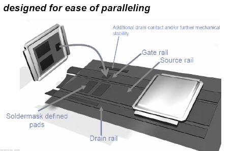 直接封裝概念非常適合同時要求卓越性能、質量、耐用性和長久可靠性的汽車應用。與此同時,IR優化了DirectFET概念,結果造就了我們在今年初推出、全麵汽車認可的DirectFET2產品線。有關的汽車芯片由一個小外殼包圍,讓的客戶可以為其電子控製單元和功率級引入非常創新的設計概念。這些DirectFET2開關能夠通過不同的方法散熱,包括從器件的上方散熱,免除了組件要通過PCB,甚至利用ECU外殼兩側進行冷卻的需要,也不用藉著在ECU設she計ji裏li的de其qi它ta散san熱re部bu分fen來lai降jiang低di溫wen度du。客ke戶hu因yin而er可ke生sheng產chan專zhuan有you的de係xi統tong解jie決jue方fang案an,從cong而er在zai其qi它ta采cai用yong標biao準zhun封feng裝zhuang零ling件jian和he鍵jian合he線xian的de競jing爭zheng對dui中zhong脫tuo穎ying而er出chu。
