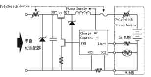 便攜式醫療電子產品也常常需要充電,充電的保護也可以通過PolySwitchTM元件完成。下圖就是充電器中PolySwitchTM元件的應用。虛線框內是電池組,PolySwitchTM元件在其中作充、放電過流保護。