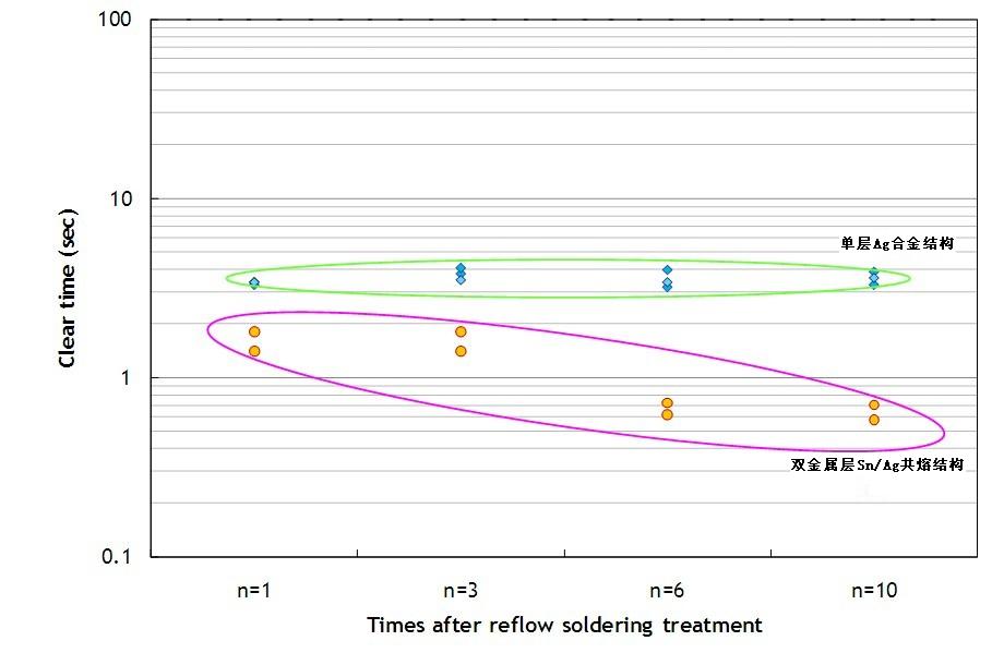 單層Ag合金結構的保險絲即使經過多次高溫熱處理,仍可以維持較穩定的熔斷時間。但是雙層Sn/Ag共熔結構的保險絲,其熔斷時間有明顯變快的趨勢。