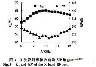 該射頻接收前端SIP為12層LTCC基板,基板尺寸為39 mm×20 mm×1.2 mm。內部貼裝GaAs MMIC、CMOS控製電路12個和貼片電阻、電容、電感元件三十幾個,包括LNA、衰減器、微波開關、集成電感、電容、電阻等,含4個射頻端口以及控製端和電源端若幹。采用多通道方案,通過兩個PIN單刀多擲開關來實現通道濾波器組之間的切換。對連接PIN開關的微帶線與帶狀線濾波器之間的過渡用金屬填孔孔徑大小進行了優化,以實現最小的過渡損耗。濾波器全部集成在LTCC基ji板ban之zhi中zhong,為wei了le保bao證zheng濾lv波bo器qi間jian的de相xiang互hu隔ge離li,采cai用yong了le帶dai狀zhuang線xian形xing式shi的de濾lv波bo器qi進jin行xing不bu同tong層ceng間jian濾lv波bo器qi的de隔ge離li,最zui大da限xian度du減jian小xiao對dui其qi他ta電dian路lu的de影ying響xiang。為wei了le減jian小xiao後hou級ji噪zao聲sheng影ying響xiang前qian級ji放fang大da器qi采cai用yong高gao增zeng益yi的deLNA,該電路采用二次變頻技術,將二中頻下變頻為100 MHz,與傳統的采用混合電路技術製作的同類產品相比其體積縮小到原來的1/50。