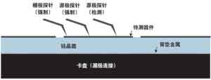 圖2顯示了測量的結構。3個MOSFET和6個探針均在圖中顯示出來,電接觸則示意性地畫出。中間的MOSFET是待測器件。