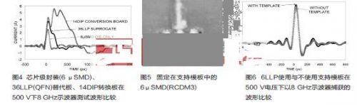 第二種處理小型集成電路的方法是使用支持模板。業界存在關於支持模塊這種方法的顧慮:由於小器件周圍有介電常數較高的材料,介電的存會在多大程度上改變集成電路與場板(field plate)之間的電容?被測器件與場板之間的電容是被測器件上應力大小的決定因素。圖5顯示了固定在CDM裝置中一個模板內的6 μSMD封裝。此時被測器件位於絕緣體中精心加工的孔,而絕緣體位於CDM裝置使用真空的場板中。圖6顯示了6LLP封裝使用與不使用FR4支持模板時以8 GHz示波器捕獲的波形。此圖顯示這模板在測試條件下僅為集成電路增加極小的應力。