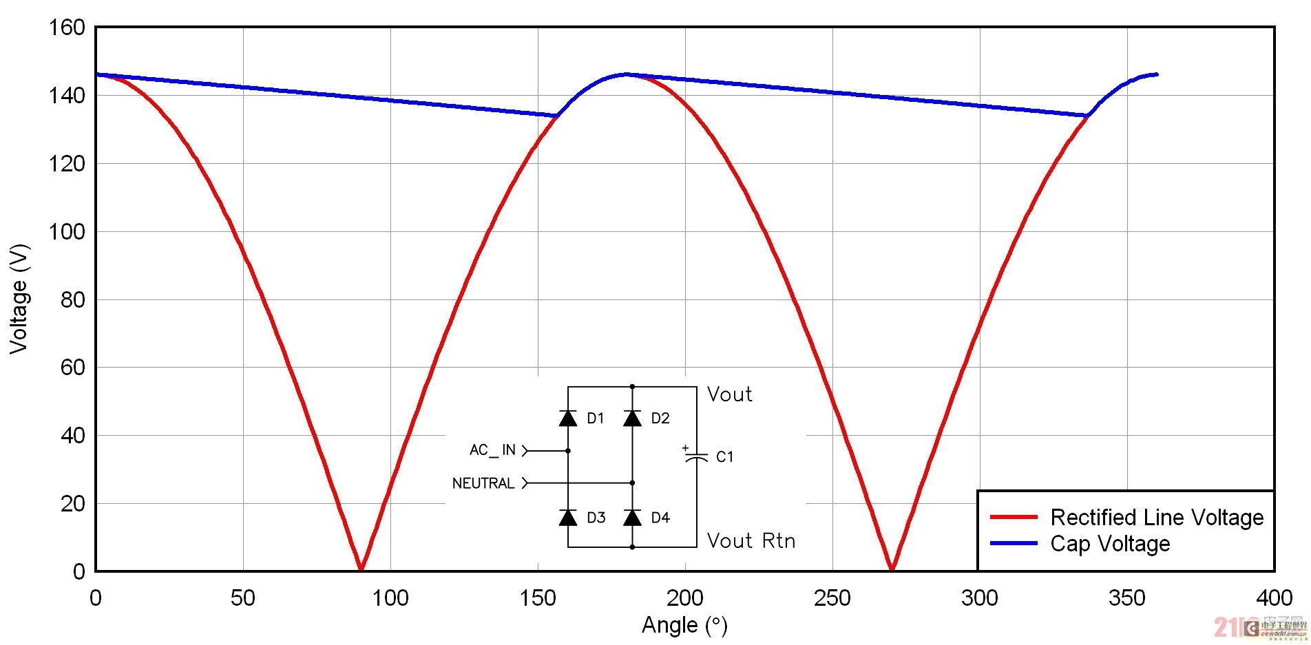 圖 1 和圖 2 顯示了離線電源中使用的兩種整流器配置結構。圖 1 為一個全波橋接,其中,AC 輸入電壓經過簡單整流以後便被送至電容。這種電路常見於寬範圍 AC 和 230 伏 AC 應用中。電容充電至正弦波峰值,然後在大部分半周期放電。電容紋波電流包括兩個部分:首先是充電周期,其電流由電容值和所應用的 dV/dt 決定;其次是電容放電。電源起到恒定電源負載的作用,因此電容以非線性速率實施放電,其計算方法為:W = ½ * C *V^2 = P * dt。
