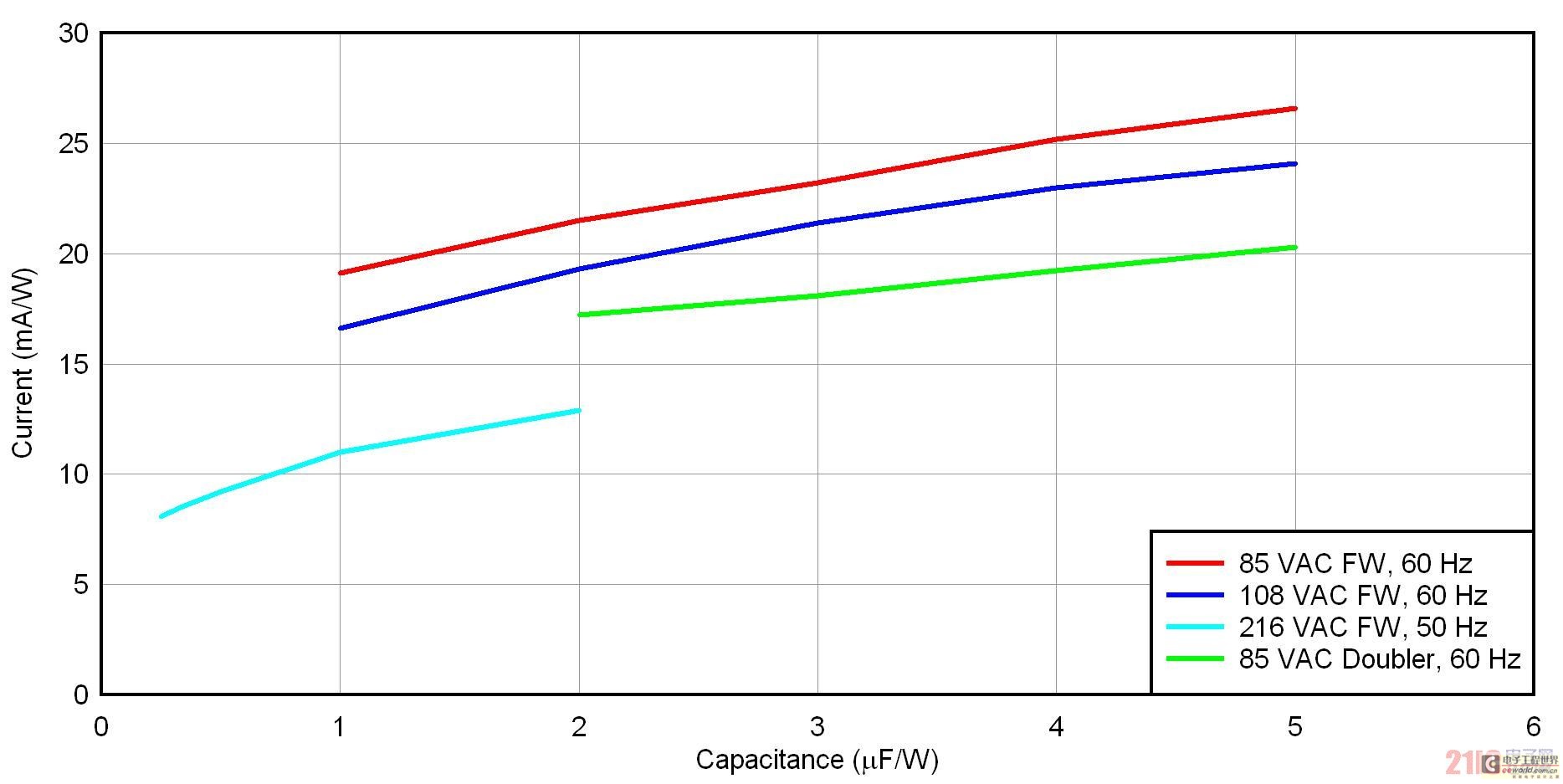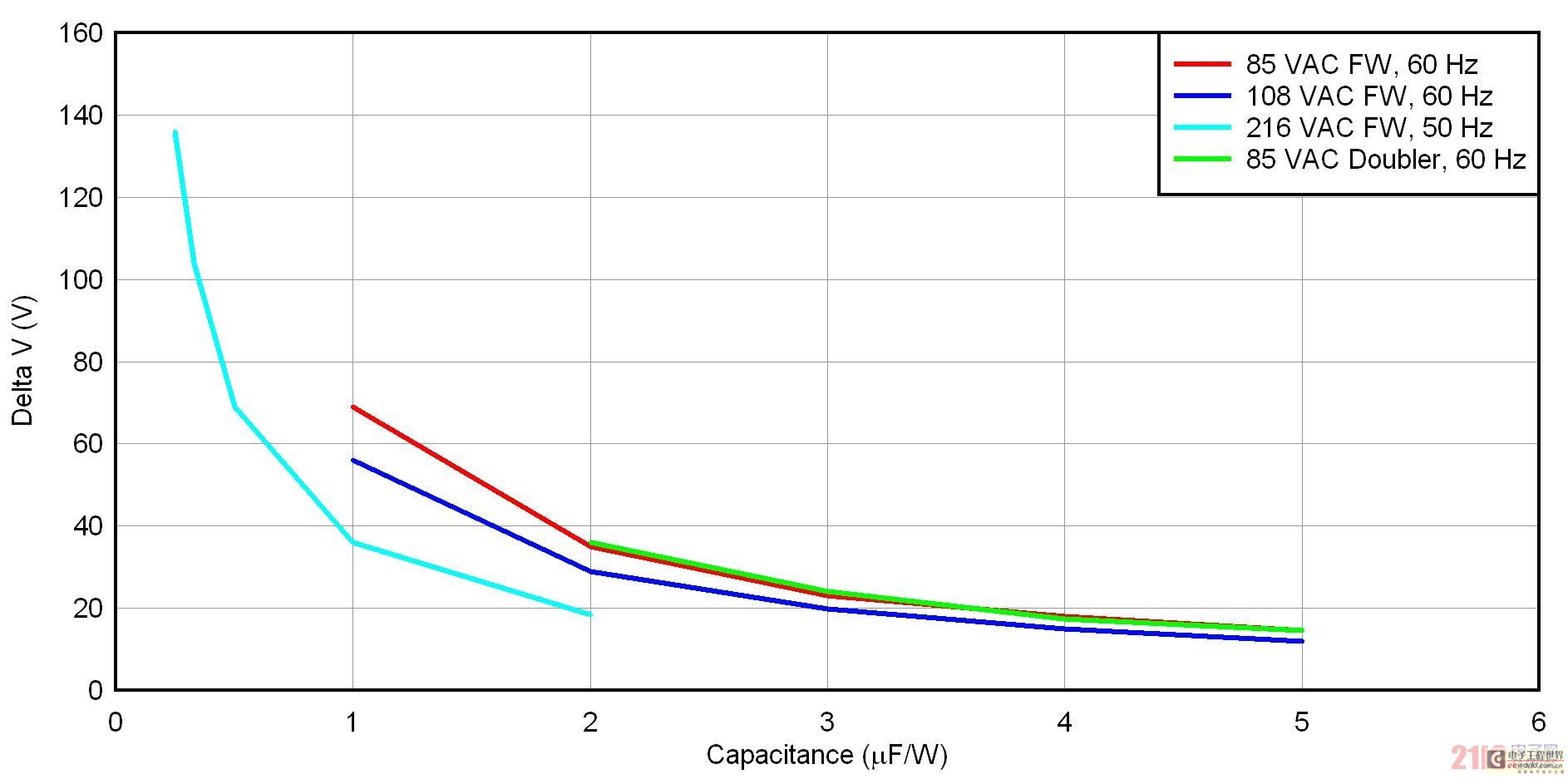 [page]圖 3 顯示了四種整流器/輸入電壓方法的 uF/W 標準化壓降。共有三種全波橋接方法,適用於低線壓美國(108 VAC/60 Hz)、低線壓日本(85 VAC/50 Hz)和低線壓歐洲(216 VAC/50 Hz)。另ling外wai,還hai有you一yi個ge低di線xian壓ya日ri本ben的de倍bei壓ya器qi。就jiu全quan波bo橋qiao而er言yan,標biao準zhun化hua過guo程cheng隻zhi需xu將jiang電dian容rong除chu以yi功gong率lv。在zai倍bei壓ya器qi中zhong,標biao準zhun化hua方fang法fa是shi將jiang兩liang個ge串chuan聯lian電dian容rong之zhi一yi的de電dian容rong除chu以yi功gong率lv。要yao想xiang使shi用yong該gai曲qu線xian圖tu,請qing首shou先xian確que定ding您nin的de整zheng流liu器qi配pei置zhi結jie構gou,並bing選xuan擇ze一yi個ge可ke以yi接jie受shou的de壓ya降jiang。之zhi後hou,您nin隻zhi需xu讀du取qu輸shu入ru電dian容rong的de uF/W 便可。最後,通過乘以您的功率,便可去標準化。