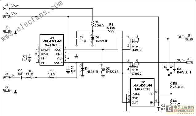 一個雙N溝道MOSFET斷開在回答有關任何輸出高電壓狀態下從線束放大器輸出。 MOSFET管(M1A及數M1B)一般上,用自己的驅動11V的齊納二極管的(4點)及其約11V的偏置元件。這種雙二極管D3提供了一個在每個輸出直流電壓二極管或連接,從而產生電壓,控製分流穩壓器U2樂隊(MAX8515)輸出。所示的電路U1的保護,一個1.4W功率AB類放大器(MAX9716)以上(聲音警告和汽車的司機的跡象)中提到的應用場合。