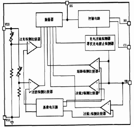 過充電保護:在充電過程中,當電池電壓高於過充電檢測電壓,且該狀態持續到過充電檢測延遲時間後,控製電路輸出一個低電平,關斷充電控製用FET2,禁止充電。