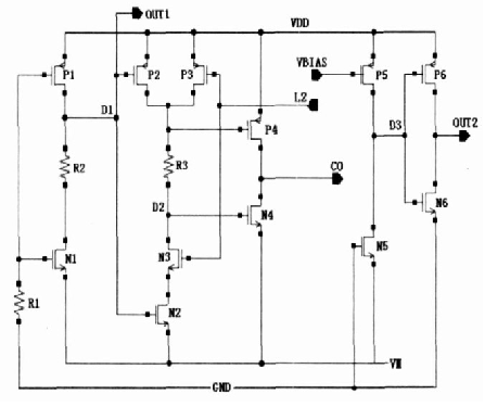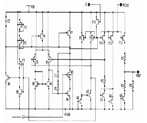 圖1中N1,N2, P1, P2, P3, C1作為啟動電路,有源電阻P1, P2 起限流作用。N5, P13 為開關管,當保護電路處於休眠狀態時,電路必須停止工作,使功耗降為最低,此時通過內部控製電路使L1 為低電位, P13 管打開,使偏置點VB IAS上升為高電位,P4, P7, P8, P9 , P10, P11, P12管截止,N5管關閉,切斷由P13,N6形成的支路,該電路停止工作,電流幾乎為零。經仿真,該基準電路在2. 2V電壓下可正常工作。