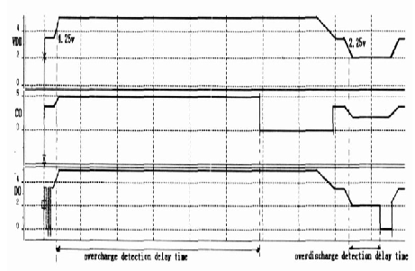 充電異常保護:電池在充電過程中如果電流過大,使VM端電壓下降,當低於某個設定值,並且這個狀態持續到過充電檢測延遲時間以上時,控製電路關斷充電控製用FET2,停止充電。當VM端電壓重新上升到設定值以上後,充電控製用FET1打開,充電保護異常解除。