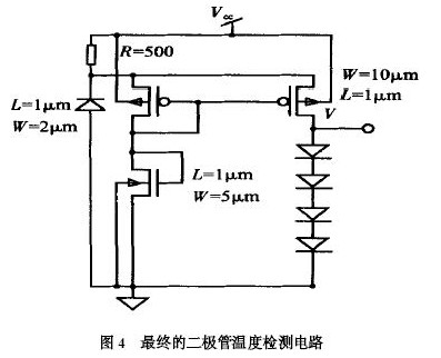 如果有些廠家不提供二極管的設計模型,隻提供三級管的模型,這時可以把三級管的c 極和b 極短接起來當作二極管來用。當然此時參數就要重新調節,這本身並不複雜。但是,如果有些廠家隻提供垂直型結構的PNP 三極管模型,這就有些麻煩。用垂直型結構的PNP 三極管的c 極和b 極短接是做不出串聯的溫度檢測電路。垂直型結構的PNP 三極管從平麵上來看是圍成一圈的結構:最裏麵是P 擴散層(三級管的e 極) ,外麵一圈是N 擴散層(三級管的b 極) ,兩者都是被一塊N 阱包圍,N 阱外麵又是一圈P 擴散層(三級管的c 極) 。最外麵的P 擴散層其實接的是P 型襯底,而P 型襯底是接地的,即c 極接地。采用這樣結構三級管的β值穩定、性能優良,但是,這樣就不能把三極管串聯使用。遇到這種情況沒有其它辦法,隻能舍棄垂直型PNP 三極管而改用其它類型的,但電路的誤差就會比較大。