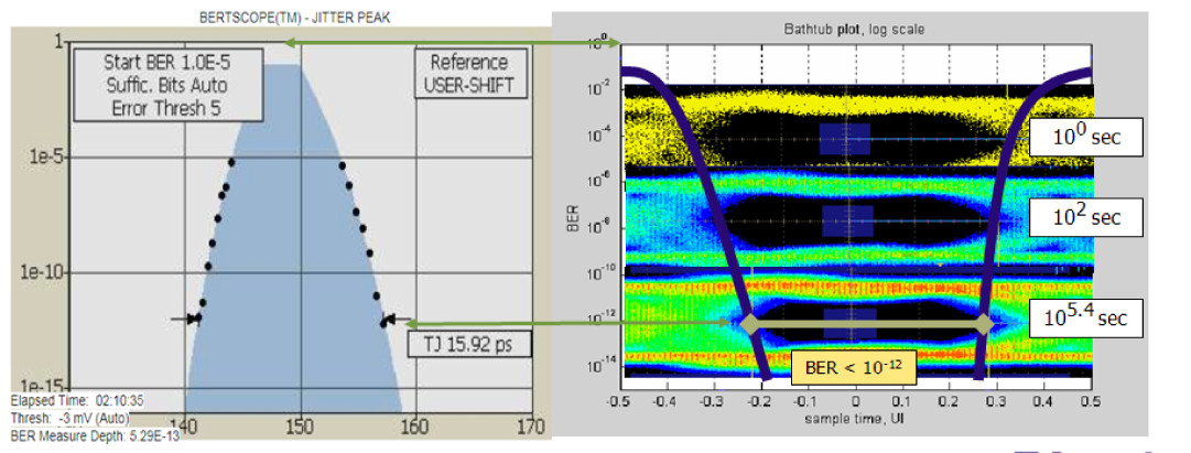 圖2 左麵BERT 抖動峰值與右麵示波器抖動浴缸之間的BER性能等效圖