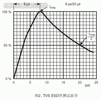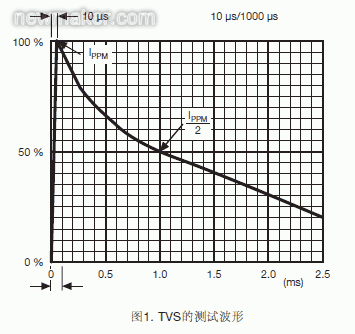 TVS的額定功率是在一定測試或應用條件下吸收浪湧的能力。10μs/1000μs脈衝波形的工業標準測試條件(Bellcore 1089標準)如圖1所示。這個測試條件不同於8μs/20μs脈衝波形的TVS瞬態電壓吸收能力測試條件,如圖2所示。