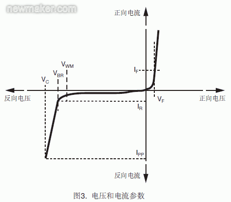 在特定的峰值脈衝電流定額下,TVS上會出現鉗位電壓。TVS的擊穿電壓在非常小的電流下測得(例如1mA或10mA),它不同於應用條件下的實際雪崩電壓。因此,半導體製造商所標注的是在大電流下的典型或最大擊穿電壓。
