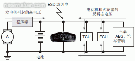 電子控製單元、傳感器和信息娛樂係統等汽車電子設備連接在一根電源線上(圖4)。這些電子產品的電源是電 池和交流發電機,這兩種電源的輸出電壓都不穩定,容易受溫度、工作狀態和其他條件影響。此外,使用燃油噴射係統、閥、電機、電氣和水解控製器等電磁線圈負 載的汽車係統,會把ESD、尖峰噪聲和其他類型的瞬態和浪湧電壓引入到電源和信號線上。