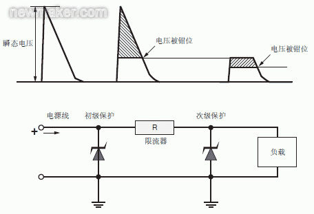 在電源線上增加電阻R可以減小瞬態電流,這樣就可以使用更小額定功率的TVS作為次級保護。電子單元中的微控製器和邏輯電路需要的電流為150mA~300mA,在-18℃下12V電池的最小輸出電壓為7.2V,同樣條件下,24V電池的最小輸出電壓為14.4V。同樣條件的24V電池中,在300mA負載、R=20Ω的條件下電源電壓為8.4V,在R=10Ω和14.4V的最低電壓(24V電池在-18℃時的電壓)條件下為11.4V。計算公式為:VL=(Vmin/(Vmin/IL))×((Vmin/IL)–R),其中,VL為負載電壓,Vmin為最小輸入電壓,IL為負載電流,R為電阻阻值,R的額定功率=I2R。