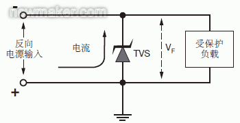 MOSFET的柵極在-1V或更低的反向電壓下也很脆弱。在反向電源輸入模式中,電源線電壓與TVS VF的電壓相同。這種反偏模式會引起電子線路故障。外延型TVS的低正向壓降能夠很好地解決這個問題。保護電路免受反向電源輸入損害的另一種方法是在電源線上使用一個極性保護整流器,如圖8所示。極性保護整流器應該有足夠的正向額定電流及正向浪湧和反向電壓性能。