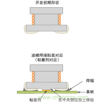 在 生產第一代LQN5N及第二代LQH32M時,雖會對部分混合IC基板進行回流焊接,但一般是對裝有插腳零部件的基板背麵進行波峰焊接。其貼裝方法是將膠 粘劑塗在基板焊盤的中央部或貼片元件電極的中央部,待其固化後將其投入波峰焊接槽。與CR貼片元件相比,體積較大的LQH係列在受到焊錫流動阻力後易發生 脫落,因此在電極間中央部位設計了突起(稱為梯級磁芯)。現在看來的話,是反向支架形狀。至今再也見不到這種結構。