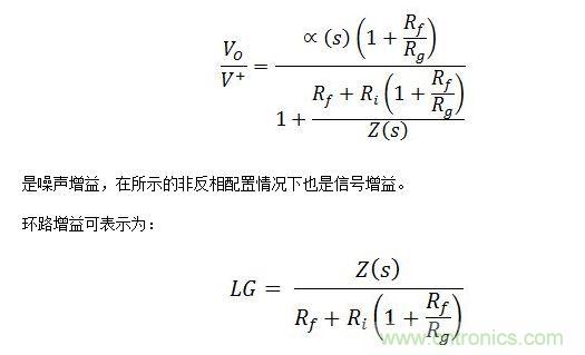 這對於理想的CFB[Ri=0]來說,是一個非常重要的公式,因為它表明了環路增益與反饋電阻的比例關係,因此反饋電阻可作為CFB的主要補償。事實上,增加反饋電阻及帶寬(BW),不僅會降低反饋電阻,同時還可增大帶寬。實際上,不可能將反饋電阻降低到特定值以下,否則放大器會發生振蕩。