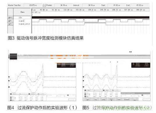 針對前文設計的驅動信號脈衝寬度檢測電路,通過仿真進行功能驗證,仿真結果如圖3所示,當驅動信號(signal)脈衝過窄時,檢測模塊輸出高電平(signal_error)信號,意味著驅動信號的高電平信號脈寬小於預先設定的脈寬門限值上限,輸出高電平報警。