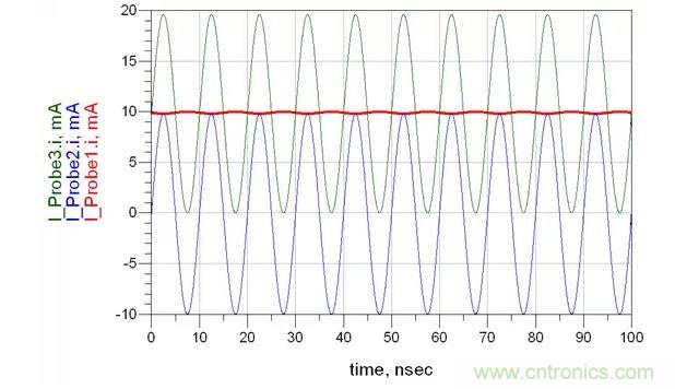 環路2由一個100MHz的AC1.0V供電,表示我們的幹擾源,電流表2測量路徑2上的電流。