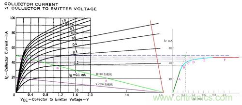 圖中假定電源電壓為4V,綠色的斜線是負載電阻為80歐姆的負載線,V/R=50MA,圖中標出了Ib分別等於0.1、0.2、0.3、0.4、0.6、1.0mA的工作點A、B、C、D、E、F。據此在右側作出了Ic與Ib的關係曲線。根據這個曲線,就比較清楚地看出“飽和”的含義了。曲線的綠色段是線性放大區,Ic隨Ib的增大幾乎成線性地快速上升,可以看出β值約為200。蘭色段開始變彎曲,斜率逐漸變小。紅色段就幾乎變成水平了,這就是“飽和”。實際上,飽和是一個漸變的過程,蘭色段也可以認為是初始進入飽和的區段。在實際工作中,常用Ib*β=V/R作為判斷臨界飽和的條件。在圖中就是假想綠色段繼續向上延伸,與Ic=50MA的水平線相交,交點對應的Ib值就是臨界飽和的Ib值。圖中可見該值約為0.25mA。