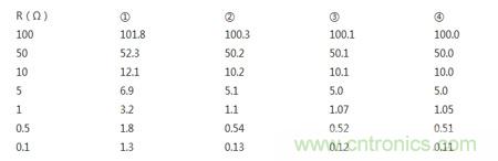 對測量結果的比較可以看出,對於100Ω的電阻,普通數字萬用表的測量相對誤差在2%左右,隨著電阻值變小,未經過改進的數字電源萬用表的測量誤差越來越大,原因主要是饋線電阻的影響;經過處理的數字表,測量5Ω電阻的相對誤差在2%以下,但受恒流源電流本身穩定度的影響,②、③測量結果的準確度也不一樣;而饋線補償法測量誤差最小,不管饋線電阻大小如何,其測量0.1Ω的相對誤差都低於10%。