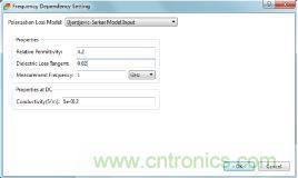模型生成好後,電容出線的兩端會自動生成Wave Port,所以不需要你手動去設置Port,這裏還有一點就是材料的參數以及孔徑需要你去設置,材料參數設置因為是前仿真,所以用Djordjevic-Sarkar Model Input簡單的頻變模型(圖7),隻需要設置一個頻點的Dk和Df值就可以求解寬帶的頻變曲線。具體設置界麵如下所示,這裏我們板材選用FR-4,Dk和Df的值選擇1GHz頻點。
