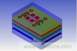 這裏我們以0402的AC耦合電容為例進行仿真,一端Botm層通過換層過孔連接Top麵的AC耦合電容,另外一端通過過孔再連接到Art12層,這裏我們分別仿真3種情況;電容掏空到GND02層,X方向掏34mil,Y方向掏66mil(Case1)。模型建好後的3D效果圖如圖4所示。