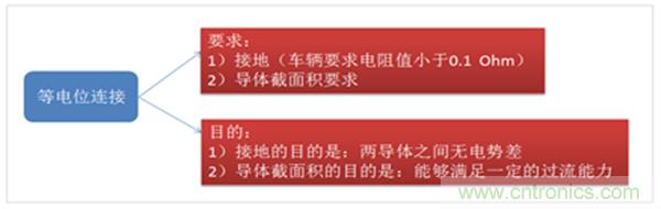 在電動汽車產品中,如果整個電池組的最大電壓超過60V(DC),就已經超過了人體安全電壓的範圍,必須進行等電位連接,以確保使用安全。
