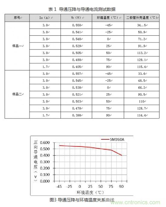 在(zai)我(wo)們(men)開(kai)發(fa)產(chan)品(pin)的(de)過(guo)程(cheng)中(zhong),高(gao)低(di)溫(wen)環(huan)境(jing)對(dui)電(dian)子(zi)元(yuan)器(qi)件(jian)的(de)影(ying)響(xiang)才(cai)是(shi)產(chan)品(pin)穩(wen)定(ding)工(gong)作(zuo)的(de)最(zui)大(da)障(zhang)礙(ai)。環(huan)境(jing)溫(wen)度(du)對(dui)絕(jue)大(da)部(bu)分(fen)電(dian)子(zi)元(yuan)器(qi)件(jian)的(de)影(ying)響(xiang)無(wu)疑(yi)是(shi)巨(ju)大(da)的(de),二(er)極(ji)管(guan)當(dang)然(ran)也(ye)不(bu)例(li)外(wai),在(zai)高(gao)低(di)溫(wen)環(huan)境(jing)下(xia)通(tong)過(guo)對(dui)SM360A的實測數據表1與圖3的關係曲線可知道:二極管的導通壓降與環境溫度成反比。在環境溫度為-45℃時雖導通壓降最大,卻不影響二極管的穩定性,但在環境溫度為75℃時,外殼溫度卻已超過了數據手冊給出的125℃,則該二極管在75℃時就必須降額使用。這也是為什麼開關電源在某一個高溫點需要降額使用的因素之一。