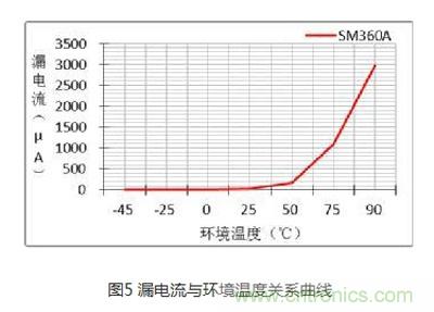 其實對二極管漏電流影響最大的還是環境溫度,下圖5是在額定反壓下測試的關係曲線,從中可以看出:溫度越高,漏電流越大。在75℃後成直線上升,該點的漏電流是導致二極管外殼在額定電流下達到125℃的兩大因素之一,隻有通過降額反向電壓和正向導通電流才能降低二極管的工作溫度。