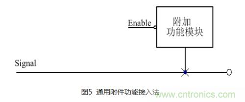 在zai高gao速su信xin號hao線xian上shang,通tong常chang會hui附fu加jia一yi些xie功gong能neng,這zhe些xie功gong能neng通tong常chang會hui帶dai來lai不bu利li的de影ying響xiang,如ru會hui產chan生sheng很hen大da的de寄ji生sheng電dian容rong,這zhe個ge電dian容rong視shi具ju體ti的de電dian路lu模mo塊kuai而er定ding。如ru果guo忽hu略lve這zhe個ge電dian容rong,可ke能neng會hui影ying響xiang這zhe個ge信xin號hao的de頻pin率lv。最zui不bu幸xing的de是shi,就jiu算suan您nin注zhu意yi到dao了le這zhe個ge電dian容rong,由you於yu附fu加jia的de功gong能neng模mo塊kuai產chan生sheng的de電dian容rong太tai大da,似si乎hu也ye無wu能neng為wei力li。通tong用yong附fu件jian功gong能neng接jie入ru法fa如ru圖tu5所示: