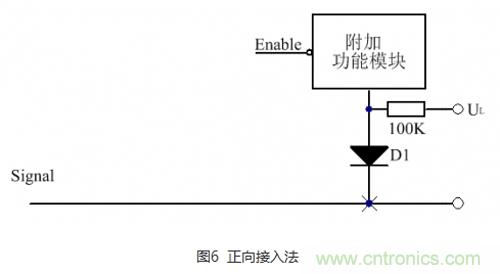 正向接入方法如圖6所suo示shi,二er極ji管guan接jie在zai信xin號hao線xian與yu附fu件jian功gong能neng模mo塊kuai之zhi間jian,這zhe表biao示shi附fu加jia功gong能neng模mo塊kuai使shi能neng時shi是shi高gao電dian平ping輸shu出chu的de。另ling外wai,為wei了le更geng大da程cheng度du地di減jian小xiao寄ji生sheng電dian容rong,通tong常chang使shi二er極ji管guan工gong作zuo在zai反fan偏pian壓ya狀zhuang態tai下xia,即jiUL jiezhididianping。zaifujiagongnengmokuaibugongzuo,erjiguanchuyuzuidafanpianyaxia,juyougengxiaodejiedianrong,xinhaoxiannenggougongzuozaigaopinzhuangtaixia,xitonghuodegenggaodexingneng。