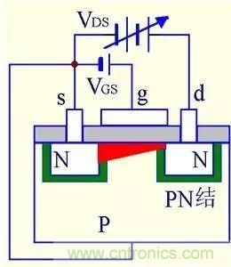 (4) VGS>0且VDS增大到一定值後,靠近漏極的溝道被夾斷,形成夾斷區。
