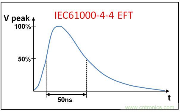 電快速瞬變(EFT)測試的是,將大量極快的瞬變脈衝耦合到信號線上,係統與外部開關電路關聯的瞬變幹擾,這類電路能夠以容性方式耦合至通信端口。EFT的纏上包括繼電器和開關觸點抖動,或者因為感性或容性負載切換而產生的瞬變, 而所有這些在工業環境中都很常見。EC 61000-4-4中定義的 EFT測試,就是去模擬這些事件產生的幹擾。