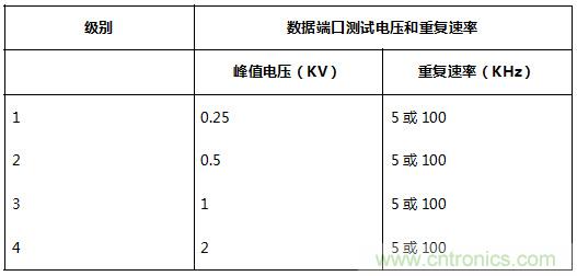 IEC 61000-4-4規定了不同環境狀況下的電壓測試級別,分為4級。同時規定了不同測試級別對應的測試電壓和脈衝重複速率。