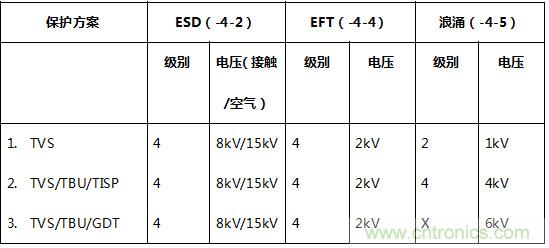 按照以上的規範要求和設計原則,下麵我們提供三種不同級別的EMC防護解決方案,這些方案都已經經過了第三方獨立EMC兼容性測試的認證。方案中用到的元器件包括: