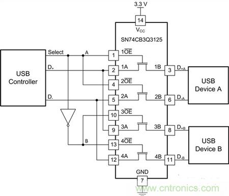 圖4:將2個USB器件複用至一個控製器時的SN74CB3Q3125接線
