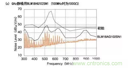 傳統型BLM18AG對300MHz和700MHz之間頻率範圍內的噪聲抑製十分有效。