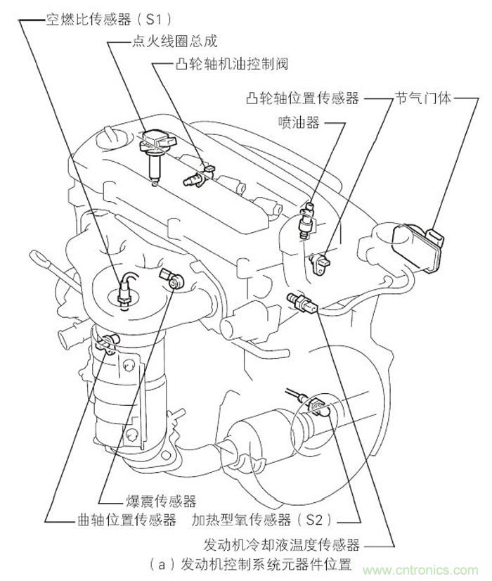 汽車元器件布置圖與汽車線束圖類似,標注了電控係統傳感器、執行器在汽車上的安裝位置,布置圖和線束圖、電路圖配合使用可以在實際維修中快速定位傳感器、執行器、繼電器、熔絲等的詳細位置,再配合插腳圖能更加準確快捷地定位故障元件。下圖為發動機控製係統元器件位置以及熔絲、繼電器安裝位置。