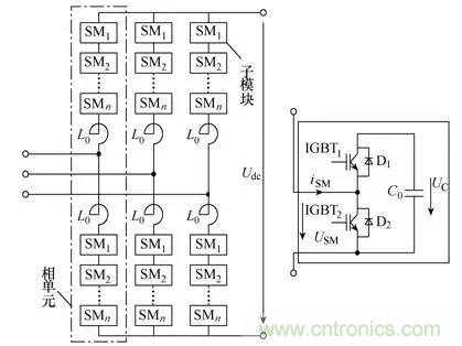 西門子公司為此設計了一種由多個子模塊串聯的模塊化多電平換流器(modular multilevel converter, MMC)。這種結構的換流器可以使全控型功率器件運行在較低的開關頻率,大大降低了電磁幹擾和損耗;同時采用排序充放電電容的均壓策略,可以輕鬆實現數量龐大的級聯模塊的動態均壓;其模塊化結構,也便於安裝及日後的維護。因此,我國近幾年的柔直工程換流器均采用MMC結構。