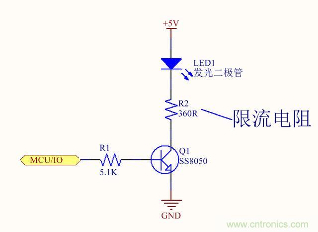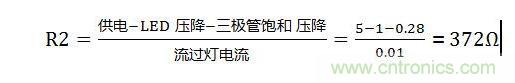 公式解析:供電5V減去三極管飽和壓降0.28V再減去LED燈發光時壓降約為1V,得出值再除以流過LED燈的電流10mA,則為所需電阻值。當然了電阻取值大點小點隻會微弱影響通過LED燈電流,發光度不會有明顯變化,我們取360的電阻。三極管飽和壓降差異不是那麼大,基本在0.2~0.5V之間,0.3V居多。