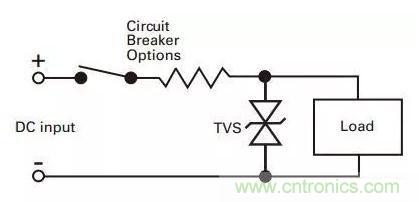 在實際的電路中,如圖2所示,在DC input的時候,有時由於供電環境的變化會帶來一些瞬時脈衝。而要消除瞬時脈衝對器件損害的最好辦法,就是將瞬時電流從敏感器件引到地,一般具體做法是將TVS在線路板上與被保護線路並聯。這樣,當瞬時電壓超過電路正常工作電壓後,TVS將發生雪崩擊穿,從而提供給瞬時電流一個超低阻抗的通路,其結果是瞬時電流通過TVS被短路到GND,從而避開被保護器件,並且在電壓恢複正常值之前使被保護回路一直保持截止電壓。而當瞬時脈衝結束以後,TVS二極管再自動恢複至高阻狀態,整個回路又回到正常電壓狀態。