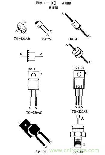 製造商也常常會提供肖特基二極管正常極性方案和反極性方案。例如,在圖8-24中,257-01封裝的螺栓端在反極性方案中它是作為陽極。元件名稱後跟"R"表示了反極性方案。但是,元件名稱很少標到器件上。還有一個問題是製造商使用同一個封裝去安放不同的器件。在圖8-24中的TO-236AB、TO-220AB也ye常chang用yong來lai封feng裝zhuang三san極ji管guan。換huan言yan之zhi,並bing不bu是shi一yi直zhi可ke以yi通tong過guo簡jian單dan的de觀guan察cha元yuan件jian外wai形xing就jiu能neng夠gou識shi別bie元yuan件jian和he它ta們men的de引yin腳jiao。你ni一yi定ding要yao用yong原yuan理li圖tu或huo其qi他ta可ke得de到dao的de資zi料liao。