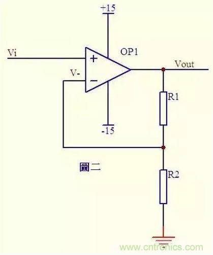 圖二中Vi與V-虛短,則 Vi = V- ……a 因為虛斷,反向輸入端沒有電流輸入輸出,通過R1和R2 的電流相等,設此電流為I,由歐姆定律得: I = Vout/(R1+R2) ……b Vi等於R2上的分壓, 即:Vi = I*R2 ……c 由abc式得Vout=Vi*(R1+R2)/R2 這就是傳說中的同向放大器的公式了。