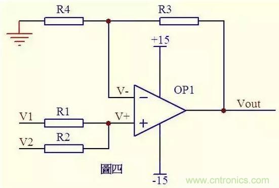 請看圖四。因為虛斷,運放同向端沒有電流流過,則流過R1和R2的電流相等,同理流過R4和R3的電流也相等。故 (V1 – V+)/R1 = (V+ - V2)/R2 ……a (Vout – V-)/R3 = V-/R4 ……b 由虛短知: V+ = V- ……c 如果R1=R2,R3=R4,則由以上式子可以推導出 V+ = (V1 + V2)/2 V- = Vout/2 故 Vout = V1 + V2 也是一個加法器。
