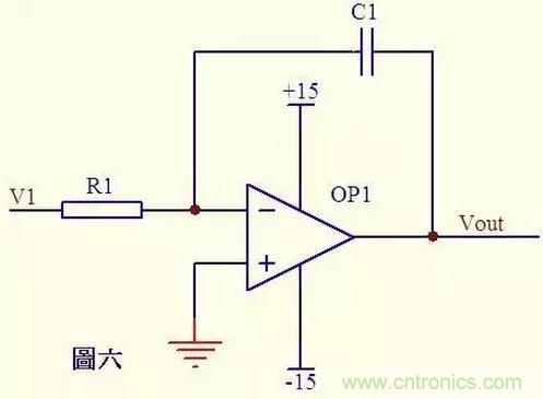 圖六電路中,由虛短知,反向輸入端的電壓與同向端相等,由虛斷知,通過R1的電流與通過C1的電流相等。 通過R1的電流 i=V1/R1 通過C1的電流i=C*dUc/dt=-C*dVout/dt 所以 Vout=((-1/(R1*C1))∫V1dt 輸出電壓與輸入電壓對時間的積分成正比,這就是傳說中的積分電路了。 若V1為恒定電壓U,則上式變換為Vout = -U*t/(R1*C1) t 是時間,則Vout輸出電壓是一條從0至負電源電壓按時間變化的直線。