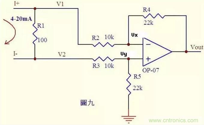 分析一個大家接觸得較多的電路。很多控製器接受來自各種檢測儀表的0~20mA或4~20mA電流,電路將此電流轉換成電壓後再送ADC轉換成數字信號,圖九就是這樣一個典型電路。如圖4~20mA電流流過采樣100Ω電阻R1,在R1上會產生0.4~2V的電壓差。由虛斷知,運放輸入端沒有電流流過,則流過R3和R5的電流相等,流過R2和R4的電流相等。 故: (V2-Vy)/R3 = Vy/R5 ……a (V1-Vx)/R2 = (Vx-Vout)/R4 ……b 由虛短知: Vx = Vy ……c 電流從0~20mA變化,則V1 = V2 + (0.4~2) ……d 由cd式代入b式得(V2 + (0.4~2)-Vy)/R2 = (Vy-Vout)/R4 ……e 如果R3=R2,R4=R5,則由e-a得Vout = -(0.4~2)R4/R2 ……f 圖九中R4/R2=22k/10k=2.2,則f式Vout = -(0.88~4.4)V,即是說,將4~20mA電流轉換成了-0.88 ~ -4.4V電壓,此電壓可以送ADC去處理。