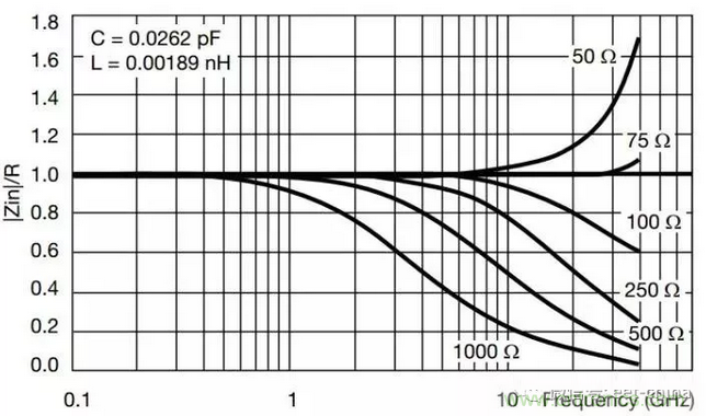 上圖電阻的高頻特性非常好,可以看到極間電容隻有0.03pF,引線電感隻有0.002nH,其中75Ω的電阻可以到30GHz。我們通常使用的貼片電阻大都是厚膜電阻,性能遠達不到如此,其引線電感有幾個nH,極間電容也有幾個pF,大多隻能用到幾百MHz或幾個GHz。