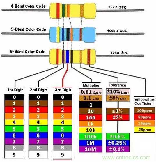從cong左zuo往wang右you,前qian兩liang個ge或huo三san個ge環huan代dai表biao數shu字zi,接jie下xia來lai的de環huan代dai表biao乘cheng數shu,與yu前qian麵mian的de數shu字zi相xiang乘cheng便bian是shi阻zu值zhi。再zai接jie下xia來lai的de環huan代dai表biao電dian阻zu的de容rong差cha,最zui後hou就jiu是shi電dian阻zu的de溫wen度du係xi數shu。