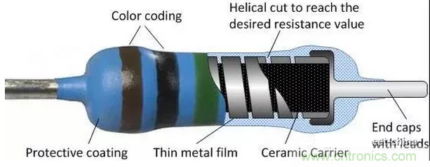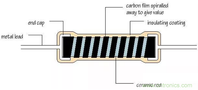 碳膜電阻主要是在陶瓷棒上形成一層碳混合物膜,例如直接塗一層,碳膜的厚度和其中碳濃度可以控製電阻的大小;為了更加精確的控製電阻,可以在碳膜上加工出螺旋溝槽,螺旋越多電阻越大;最後加金屬引線,樹脂封裝成型。碳膜電阻的工藝更加複雜一點,可以做精密電阻,但由於碳質的原因,還是溫度特性不太好。